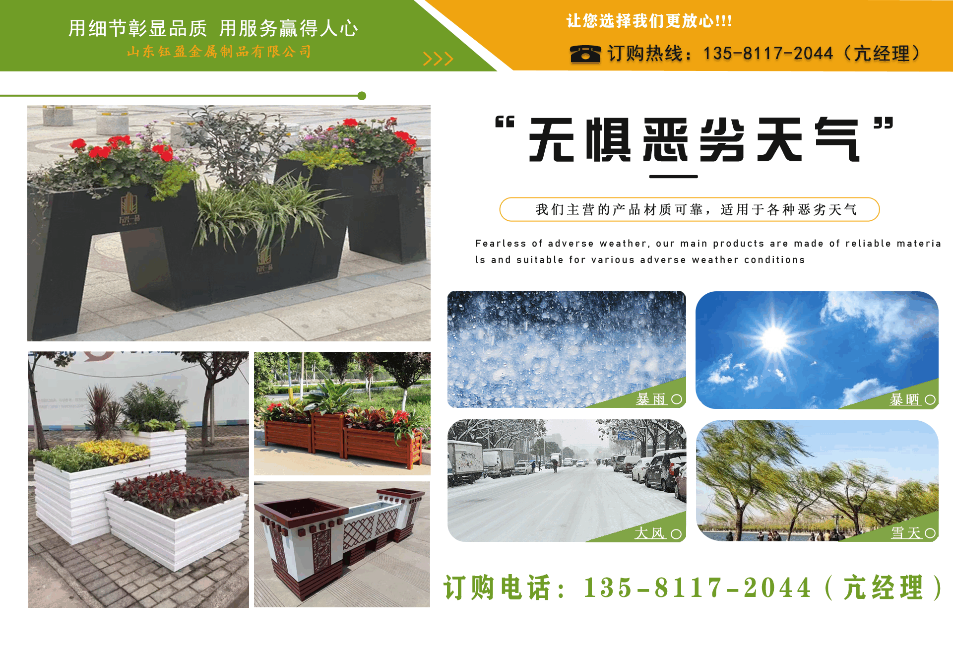 山東鈺盈金屬制品有限公司主營鍍鋅板花箱,道路隔斷花箱,定制花箱,戶外道路花箱,花箱座椅等產品,產品結構合理、性能優良,具有強度高、耐腐蝕、抗老化、隔熱隔音、節約能源、外形美觀、使用壽命長等優點,深受國內外客戶認可?! ∥覀兏鶕蛻羲诔鞘械奈幕卣?,制造出符合當地城市文化氣息的自然立體、觀賞性強的花箱產品成為城市里一道靚麗的風景線?! 」緦嵭姓\實、公正、守信、價格合理、平等互利?! 」緫{借雄厚經驗實力,恪守誠信為本的原則,得到了眾多客戶的信賴,并在業界獲得良好的口碑。建立了穩固的合作關系,隨著業務的不斷發展和壯大,合作伙伴的范圍也在不斷擴大。我們熱情盼望與您的合作,為社會的可持續發展獻上一份努力。...